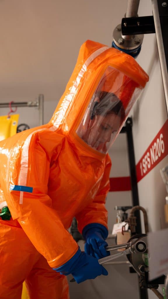 La MR CHIM est une combinaison intégrale ventilée à usage unique la plus résistante du marché, développée dans un contexte de gestion des déchets militaires et paramilitaires, utilisable en industrie.