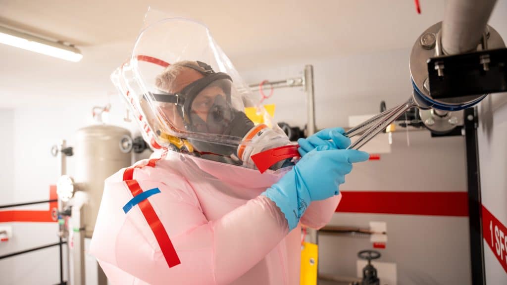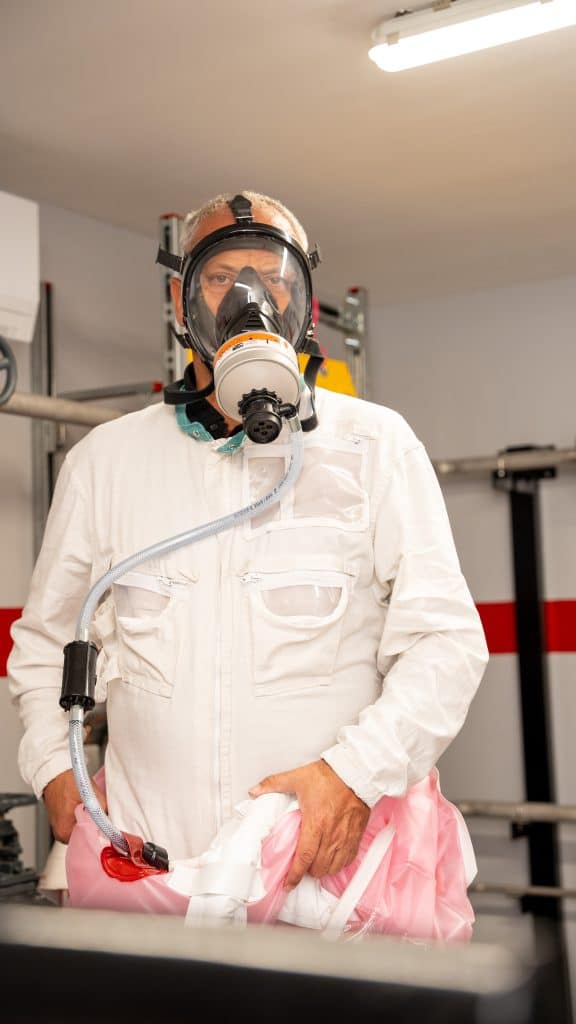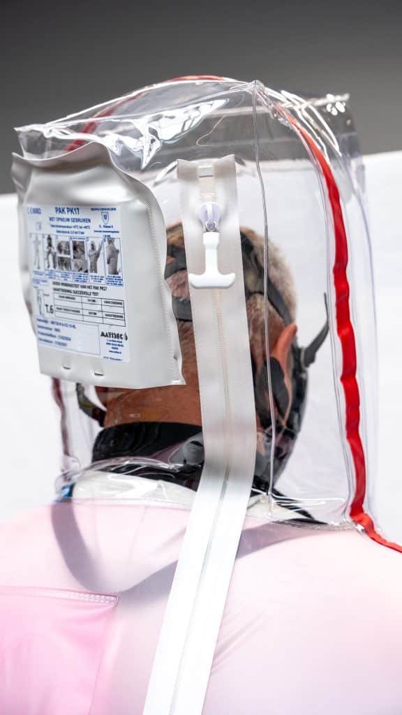 - La tenue étanche ventilée PK17 possède les mêmes atouts que la tenue MRV5 avec une protection renforcée des voies respiratoires par l’intermédiaire d’un masque conforme aux exigences EN 136 et d’une cartouche filtrante.