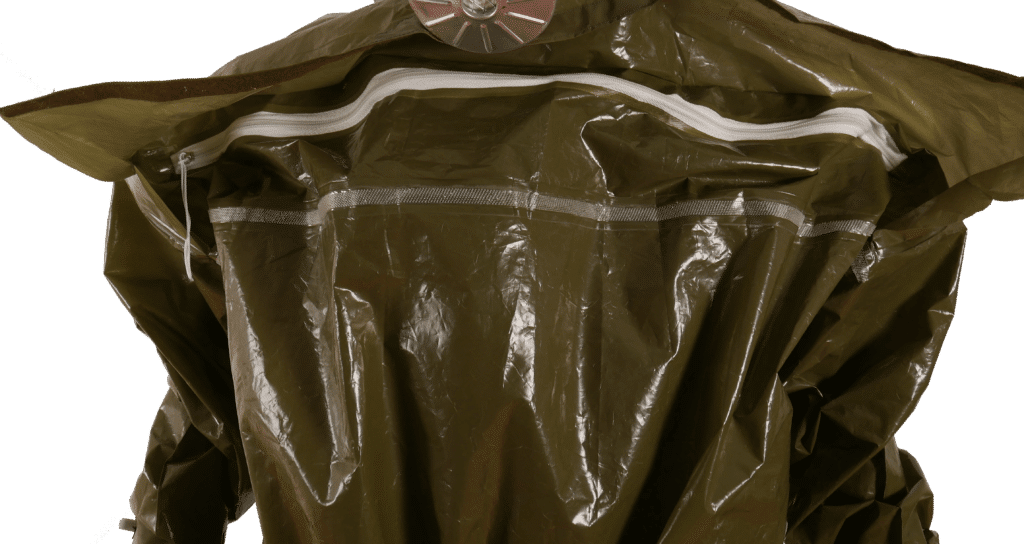 - La combinaison de protection chimique étanche aux liquides de type 3 et 4 EN 14605, spécialement conçue et conditionnée pour l’évacuation d’urgence contre les risques biochimiques et les toxiques de guerre.